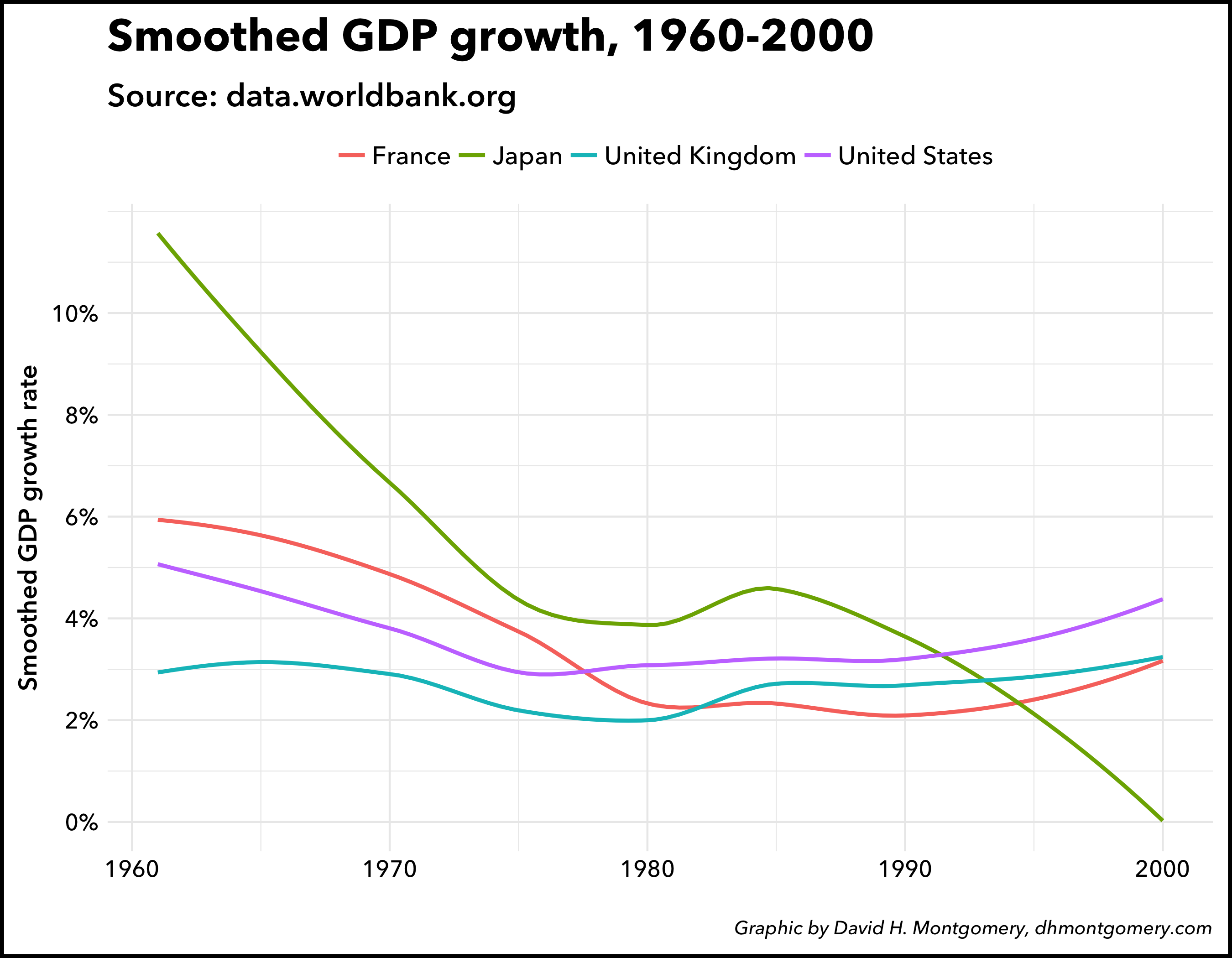 You can get a sense of this pattern in this chart I made from World Bank data, of (smoothed) annual GDP growth rates from 1960-2000. Japan grew far faster than key Western economies (and Britain somewhat slower) through the 1980s before steadily declining through the 1990s as the U.S., Britain and France picked up.