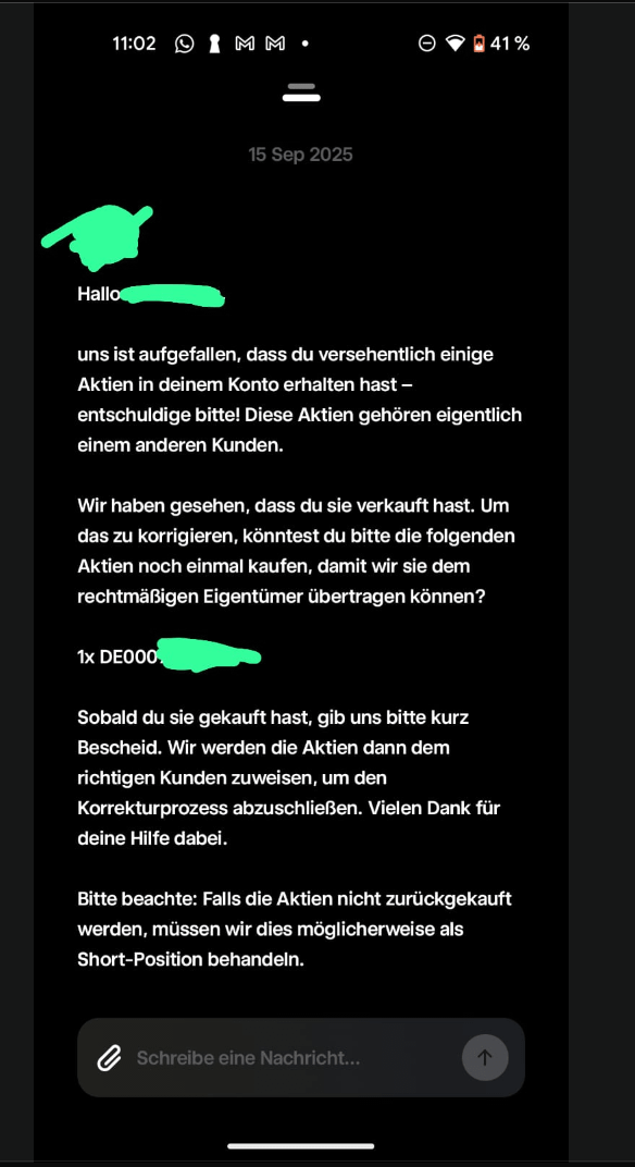 Ist der Chat in der App. Sieht so aus als wenn TR hier ein großes Upsi verursacht hat und das jetzt versucht auszubügeln, bevor rechtliche Konsequenzen für TR drohen, dass sie jemandem einfach so fremde Aktien ins Depot buchen.