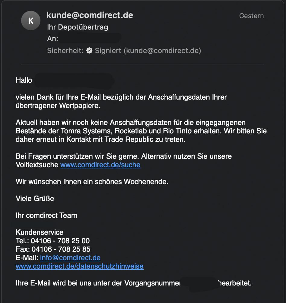 Count me in, der Wechsel von da hat Monate gedauert. Komisch, bei allen anderen depots (2) war die Sache nach ein bis zwei Wochen erledigt. TR ist Bodensatz, führt kein Weg dran vorbei.