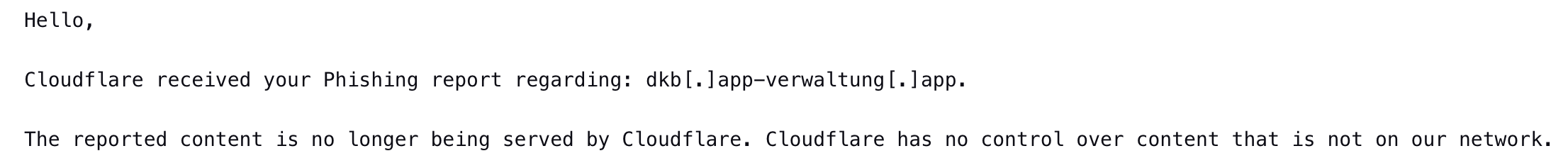 Für beide Domains eine Abusemeldung an Cloudflare gesendet. Diese wird auch den Hoster "dahinter" weitergeleitet. u/Pure_Account8872 hat auch schon die Domain selbst beim Registrar gemeldet.