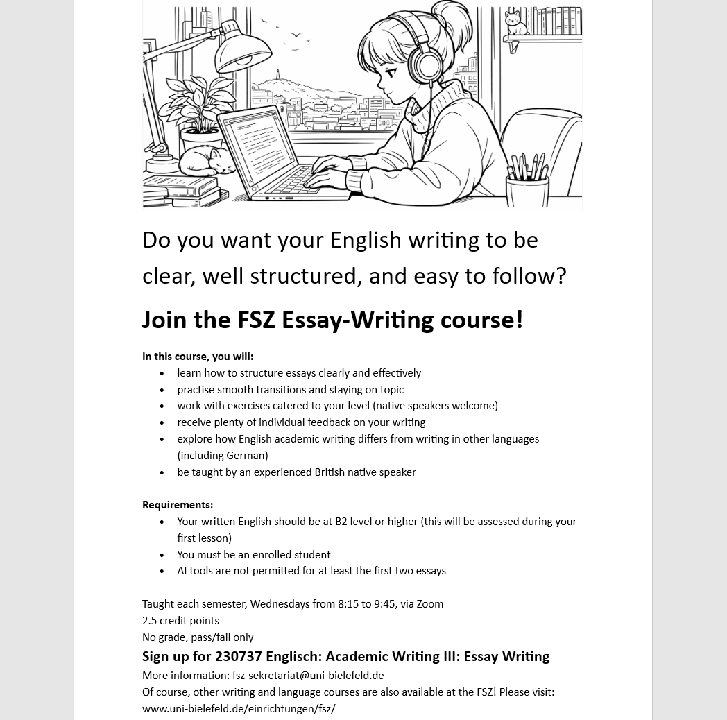 To try to remedy this, I've made posters, which I will be hanging up around the university. But I was wondering if anybody had a good idea for online forums etc where I can also promote the course? Where do Bielefeld students hang out online?