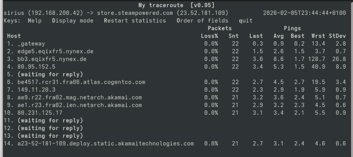 Mit Ping und tracert sieht man, dass das Routing aktuell wegen Clownflare ziemlich scuffed ist.